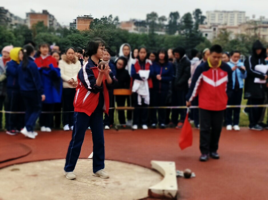 让时间回到2017年11月23日上午11时许,女子跳远赛场上,选手们正在紧张的进行着热身运动。有一些选手已经开始脱去校服换上短袖T恤和田径裤了,她们都在心里暗自和对手们打着心理战。而高一11班的选手李颖涛身着一件粉色卫衣正在一旁从容地做着准备活动,完全没有为旁边的田径裤“大军”所震慑。而其他选手现在或许还并不知道这位低调的选手曾获得过昆明市跳远第一名,果然高手都是深藏不露的……终于,选手们开始了他们的第一跳,于是我移步到沙坑侧部,准备用相机捕捉选手们英姿飒爽的身影。这时,一个熟悉的粉色身影从镜头前飞过,我眼疾手快地按住了拍摄键,抓到了这令人振奋的瞬间……当时的我并不知道就是这一跳打破了尘封许久的校记录!
